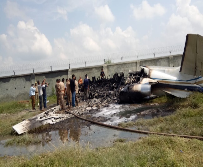 जो पूरी तरह सुरक्षित हैं। आग को दमकल कर्मी बुझाने में जुटे हैं। लेंडिंग के दौरान चार्टर्ड प्लेन तारों से टकरा गया था। प्लेन कैप्टन किशोर व दीपक के अलावा इंजीनियर रामप्रकाश गुप्ता, प्रभात त्रिवेदी, आनंद कुमार व कार्तिक सवार थे।सभी को इलाज के लिए अस्पताल में लाया गया है।