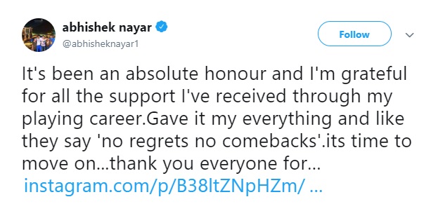 बुधवार को मुंबई के क्रिकेटर अभिषेक नायर ने लिखा है, “यह मेरे लिए सम्मन की बात और मैं अपने करियर के दौरान मिले सपोर्ट के लिए सभी का धन्यवाद देता हूं। मैंने अपना सबकुछ दिया और अब मैं कह सकता हूं कि मुझे कमबैक का कोई पछतावा नहीं है। इतना प्यार देने के लिए परिवार, दोस्त, साथी खिलाड़ी और फैंस का शुक्रिया।”