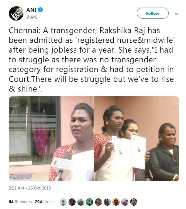 नई दिल्ली चाहे शिक्षा, सामाजिक स्वीकृति हो या फिर अधिकार पाना समाज के तीसरे वर्ग को हमेशा ही समाज में अपनी जगह बनाने के लिए काफी मशक्कत करनी पड़ती है। कुछ ऐसी ही कहानी है तमिलनाडु की ट्रांसजेंडर रक्षिका राज की। दरअसल, रक्षिका राज को पंजीकृत नर्स के रूप में रजिस्टर्ड कर लिया गया है। इस वजह से करीब एक साल तक उन्हें नौकरी नहीं मिली।