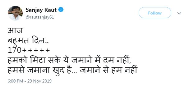 वहीं,शिवसेना के नेता संयज राउत ने ट्वीट कर 170 से अधिक विधायकों के समर्थन का दावा किया है। उन्होंने ट्वीट कर कहा कि आज बहुमसाबित करने का दिन 170+++++……..। आगे लिखा कि हमको मिटा सके ये जमाने में दम नहीं, हमसे जमाना खुद है… जमाने से हम नहीं।
