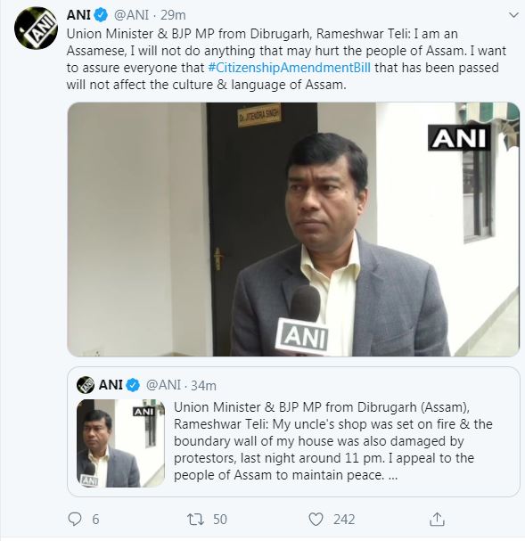 डिब्रूगढ़ (असम) के केंद्रीय मंत्री और भाजपा सांसद, रामेश्वर तेली ने कहा कि कल रात लगभग 11 बजे मेरे चाचा की दुकान में आग लगा दी गई और मेरे घर की बाउंड्री वॉल को भी प्रदर्शनकारियों ने क्षतिग्रस्त कर दिया, मैं असम के लोगों से शांति बनाए रखने की अपील करता हूं।