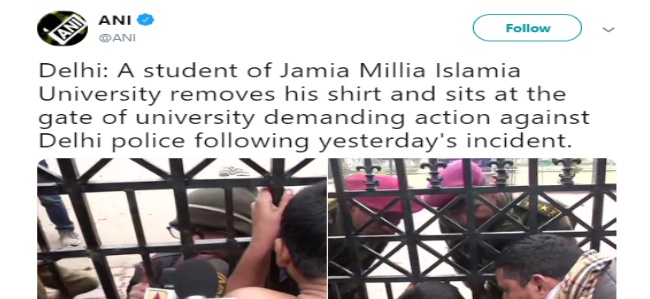 - सोमवार सुबह जामिया मिल्लिया इस्लामिया (Jamia Millia Islamia University) के गेट पर एक छात्र शर्ट उतार पर प्रदर्शन कर रहा है। उसकी मांग की है कि दिल्ली पुलिस के उन कर्मियों के खिलाफ कार्रवाई की जाएं, जिन्होंने छात्रों की पिटाई की है।