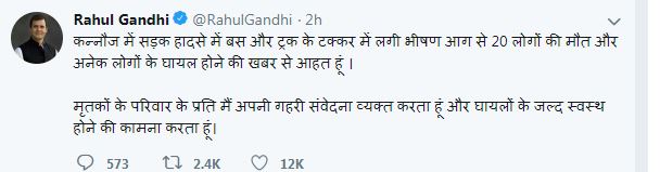 कांग्रेस नेता राहुल गांधी ने कन्नौज में सड़क हादसे में बस और ट्रक के टक्कर में लगी भीषण आग से 20 लोगों की मौत और कई लोगों के घायल होने की खबर से आहत हूं। मृतकों के परिवार के प्रति मैं अपनी गहरी संवेदना व्यक्त करता हूं और घायलों के जल्द स्वस्थ होने की कामना करता हूं।
