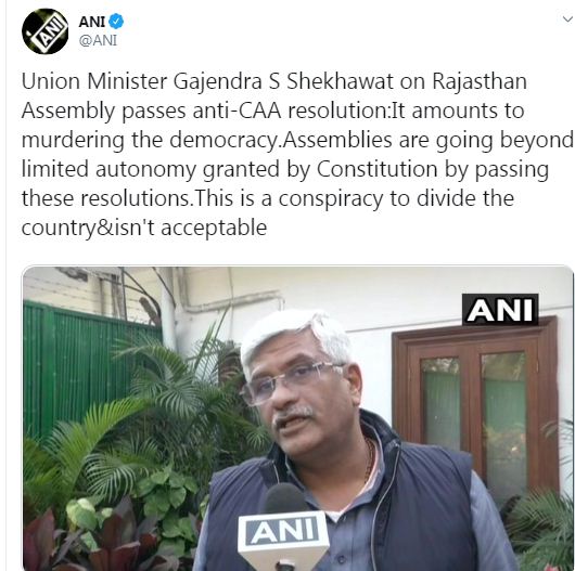 केंद्रीय मंत्री गजेंद्र सिंह शेखावत ने इस प्रस्ताव का विरोध किया है। यह लोकतंत्र की हत्या करने जैसा है। विधानसभाएं इन प्रस्तावों को पारित करके संविधान द्वारा दी गई सीमित स्वायत्तता से परे जा रही हैं। यह देश को विभाजित करने के लिए एक साजिश है और इसे बिल्कुल स्वीकार्य नहीं किया जाएगा।