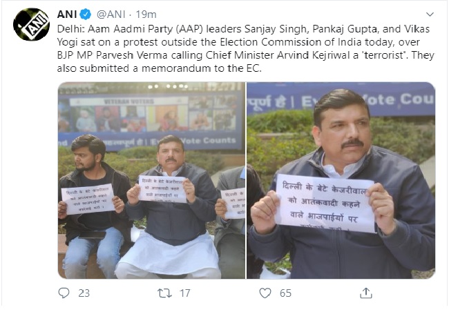 प्रदर्शन कर रहे इन नेताओं ने हॉर्डिंग्स भी पकड़े हैं, जिन पर लिखा है- “दिल्ली के बेटे केजरीवाल को आतंकवादी कहने वाले पर कार्रवाई करो।” इस मामले पर संजय सिंह का कहना है, “हमारी मांग है कि प्रवेश वर्मा के खिलाफ एफआइआर दर्ज की जाए और उनके खिलाफ सख्त एक्शन लिया जाए।” वहीं पंकज गुप्ता का कहना है कि वर्मा को चुनाव प्रचार के लिए प्रतिबंधित करना काफी नहीं है उनके खिलाफ एफआइआर भी दर्ज की जानी चाहिए।