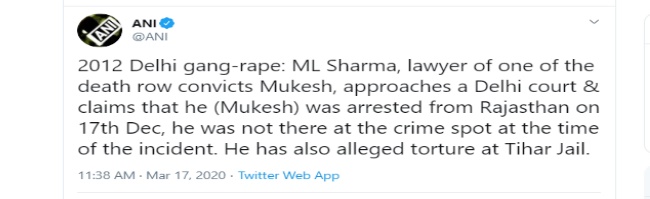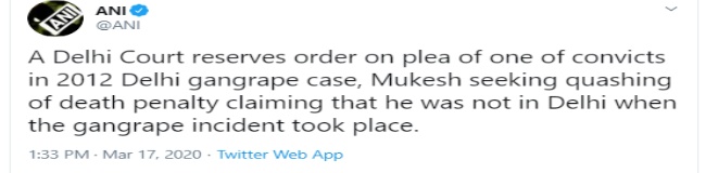 हैरानी की बात तो यह है कि मुकेश ने यह पैंतरा आगामी 20 मार्च को होने वाली फांसी से सिर्फ 3 दिन पहलेचला है। सवाल यह भी उठ रहा है कि अब तक उसने ऐसी याचिका आखिर कोर्ट में क्यों नहीं दायर की कि वह घटनास्थल या घटना के दिन दिल्ली में ही नहीं था।