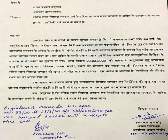 अरगोड़ा अंचल के अंचल निरीक्षक ने अपनी शिकायत में लिखा है कि सरकार ने 22 मार्च को आदेश जारी किया कि गंभीर संक्रमित बीमारी कोरोना वायरस से बचाव के लिए लॉक डाउन का आदेश घोषित किया गया था। इस आदेश का प्रचार-प्रसार भी किया गया था। इसी आदेश का अनुपालन के लिए आवश्यक वस्तुओं की दुकान जैसे मेडिकल, राशन, सब्जी, डेयरी को छोड़कर बंद रखना था। इस दरम्यान डोरंडा बाजार स्थित रसिक लाल मिष्ठान भंडार को खुला पाया गया। जबकि, आदेश में रेस्टोरेंट को भी बंद रखने का आदेश था। उन्होंने आदेश का उल्लंघन किया, इसलिए उनके विरुद्ध सरकार के आदेश के उल्लंघन के संबंध में प्राथमिकी दर्ज की गई है।