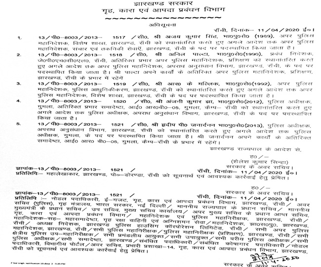 - अजय कुमार सिंह : एडीजी विशेष शाखा से एडीजी संचार एवं तकनीकी सेवा झारखंड।