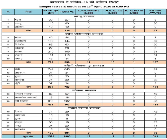 9. 13 अप्रैल : रांची हिंदपीढ़ी के तीन, बोकारो तथा गिरिडीह में एक-एक पॉजिटिव केस मिले।