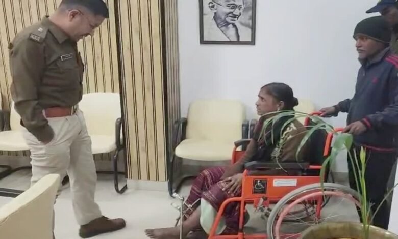 वृद्धा ने व्हीलचेयर पर बैठकर सुनाई एएसपी को फरियाद