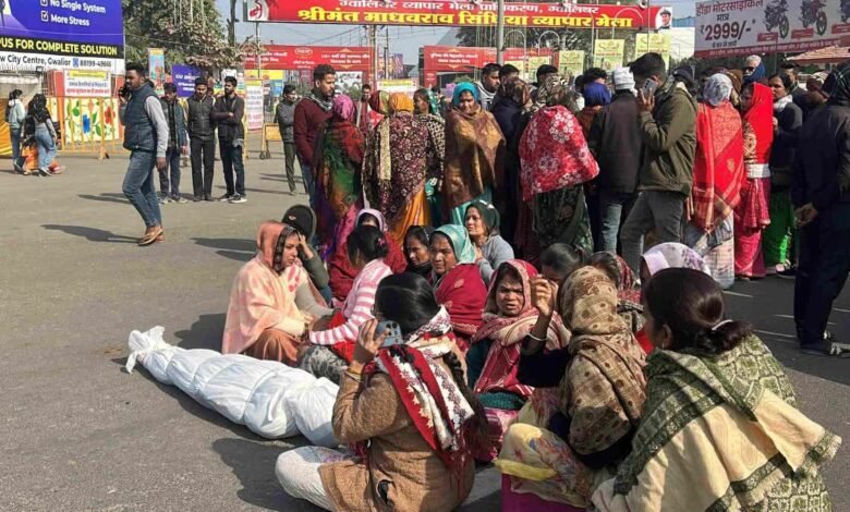 ग्वालियर : ग्वालियर व्यापार मेला द्वार के ठीक सामने सड़क हादसे में युवक की मौत के 24 घंटे बाद परिजनों ने शव रखकर घटनास्थल पर चक्का जाम कर दिया. परिजनों का आरोप है कि सोमवार दोपहर हुई मौत के बाद भी पुलिस ने न तो आरोपी वाहन चालक को गिरफ़्तार किया है न ही किसी तरह की कोई कार्रवाई की. पुलिस और प्रशासन के आला अधिकारियों समझाइश के बाद मुश्किल से 3 घंटे बाद चक्काजाम खत्म हो सका.
