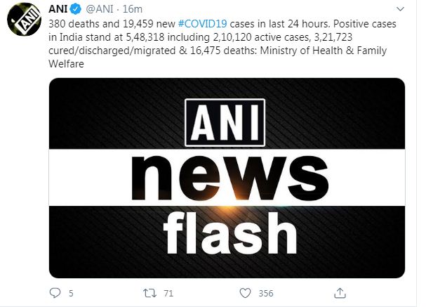 नई दिल्ली। देश में कोरोना वायरस के मामले तेजी से बढ़ रहे हैं, लेकिन इस बीच देश के लिए राहत भरी खबर ये है कि भारत में कोरोना वायरस के मरीजों के ठीक होने की दर तेजी से बढ़ रही है। देश में अब तक कोरोना वायरस के 3.20 लाख से ज्यादा मरीज ठीक हो चुके हैं। देश में बीते 24 घंटों में कोरोना वायरस के 19,459 मामले सामने आए हैं। इस दौरान देश में कोरोना से 380 लोगों की मौत हुई है।