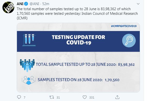 भारतीय चिकित्सा अनुसंधान परिषद (ICMR) के ताजा आंकड़ों के मुताबिक देश में 28 जून तक टेस्ट किए गए सैंपलों की कुल संख्या 83 लाख 98 हजार 362 है। वहीं 28 जून को अकेले टेस्ट किए गए सैंपलों की संख्या 1 लाख 70 हजार 560 है।