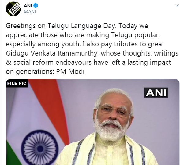 नई दिल्ली। प्रधानमंत्री नरेंद्र मोदी ने तेलुगू भाषा दिवस के अवसर पर बधाई दी है। उन्होंने ट्वीट कर कहा कि युवाओं में तेलुगू को लोकप्रिय बनाने वाले प्रशंसा के हकदार हैं। इसके साथ ही उन्होंने गिदुगु वेंकट राममूर्ति को श्रद्धांजलि देते हुए कहा कि उनके विचार और लेखन ने पीढ़ियों पर गहरा प्रभाव डाला है।