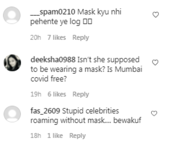 निया की इस पोस्ट पर कई लोगों ने एतराज़ जताया। एक यूज़र ने लिखा- सेलेब्रिटीज़ अभी भी मास्क लगाकर घूमते हैं, मगर यह हमेशा बिना मास्क के दिखती हैं। एक अन्य यूज़र ने लिखा- मास्क क्यों नहीं पहनते यह लोग? एक यूज़र ने पूछा कि यह मास्क क्यों नहीं लगा रही है? क्या मुंबई में कोविड ख़त्म हो गया है?