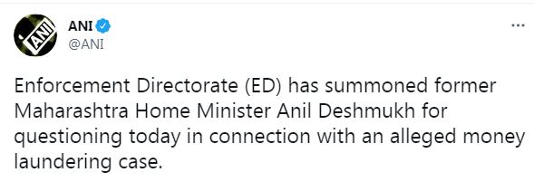 100 करोड़ वसूली मामला: महाराष्ट्र के पूर्व गृह मंत्री अनिल देशमुख को ED का समन, पूछताछ को बुलाया